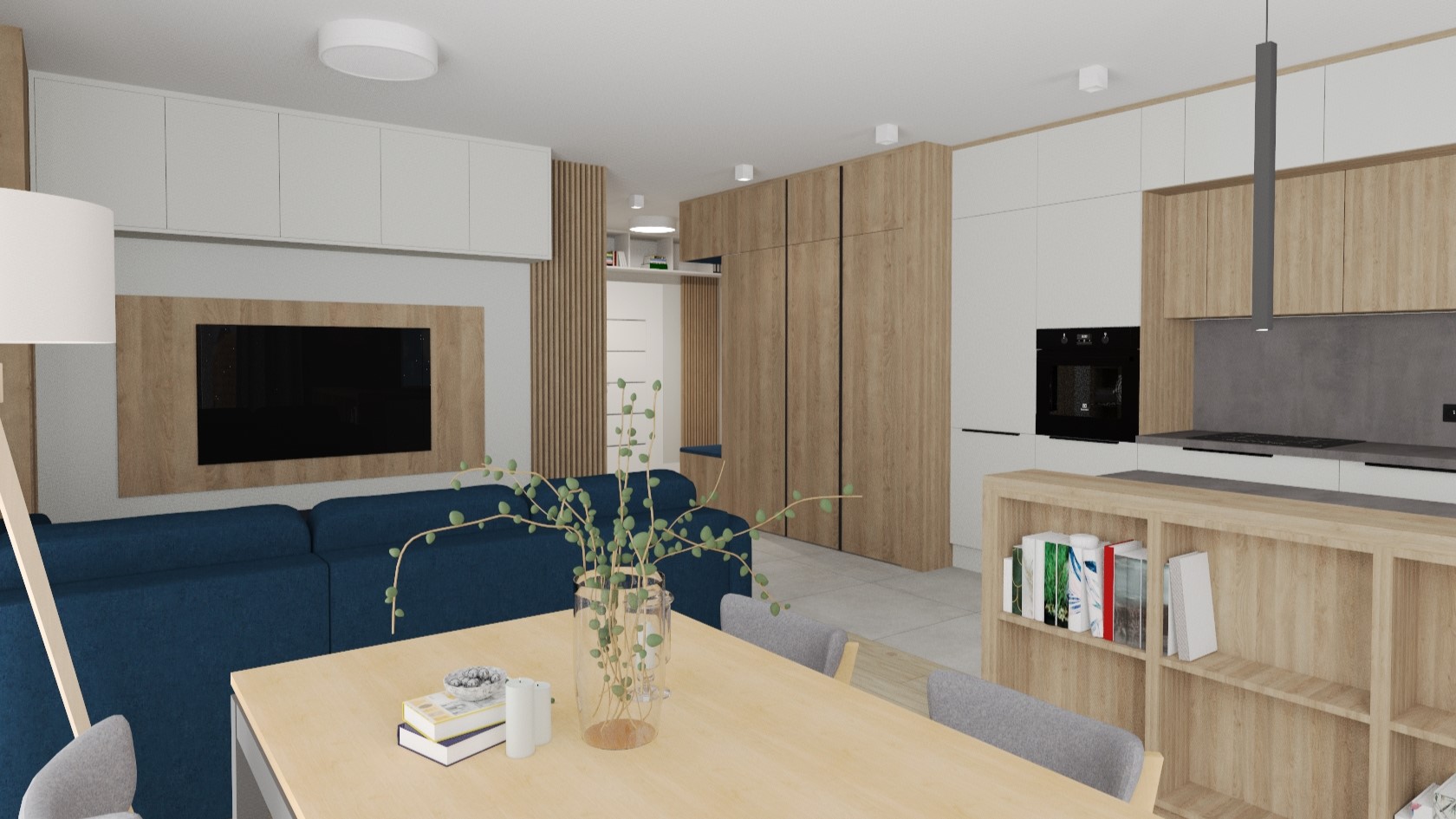 Całość utrzymałyśmy w odcieniach granatu, szarości i jasnego dębu. Jest nowocześnie i minimalistycznie, ale przytulnie. Wszystko za sprawą wyśmienitej współpracy z Klientem...